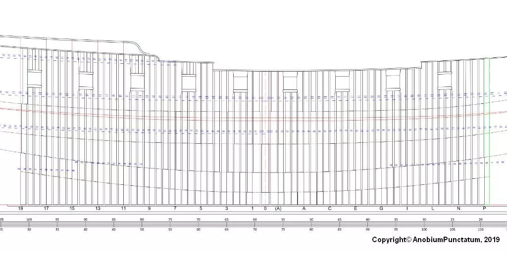 Die seitlichen Maße der Hölzer lassen sich dem Disposition of Frames Plan entnehmen; für die „moulded“-Werte muss ich auf die Tabellen der beiden Bücher zurückgreifen. Leider wurde das Spantgerüst zwischen den Station-Lines E und I sowie, 7 und 19 im Plan nicht dargestellt, so dass ich für diese Bereiche nur auf die theoretischen Werte zurückgreifen kann.