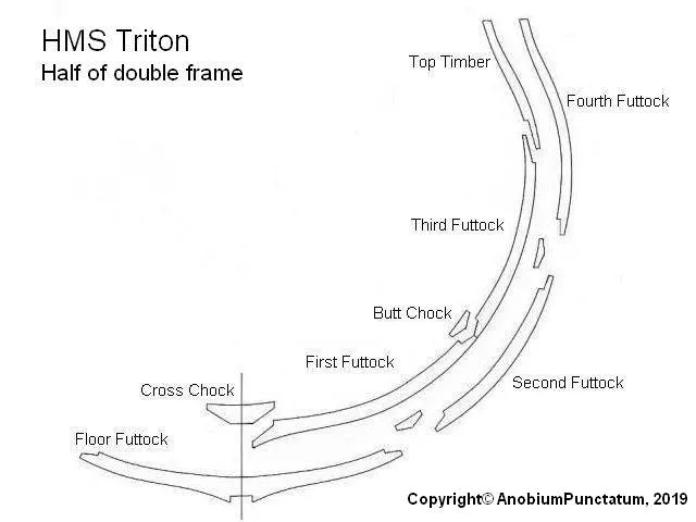 Während bei einem französischen Kriegsschiff das Spantgerüst nur aus Doppelspanten bestand, wurde im englischen Schiffbau des 18. Jahrhunderts das Spantgerüst aus einem Doppelspant gefolgt von zwei Einzelspanten aufgebaut. (es gibt auch Ausnahmen zu dieser Regel, z.B. die die Schiffe der Tisiphone Class, die ausschließlich Doppelspanten hatten) Im Ausschnitt des DOF-Plans der HMS Triton habe ich die Doppelspanten dunkelbraun und die Füllspanten hellbraun angelegt. Der Plan zeigt auch direkt eine Besonderheit der Schiffsklasse, nämlich die überbreiten Spanten bei Station 0.