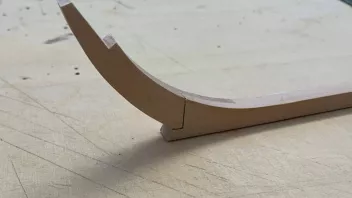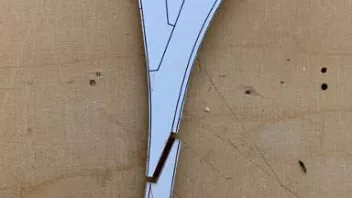 Als nächstes wurden die beiden Bauteile des "Upper stem" zusammengeklebt. Seitlich wurde bewusst etwas mehr Material stehen gelassen, um die Bautoleranzen später ausgleichen zu können. Anschließend wurde die Fuge zwischen dem neuen Bauteil und dem "Lower stem", solange mit Fräse, Stechbeiteln und Schleifpapier angepasst, bis das obere Ende des Stevens mit der Vorlage übereinstimmt. Nun konnten die Bauteile verklebt werden.