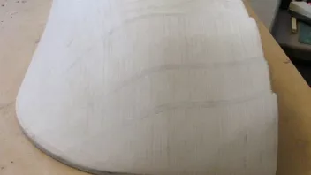Jetzt wurde das "Knee of the Head in Form geschliffen. Es verjüngt sich vom Kiel bis zur oberen Ecke der Vorderkante von ca 10.5'' (gem SR 9.5'') auf 7,5''; die Hinterkante hat eine konstante Breite von 10,5''. Um die Maße auf das Holz zu übertragen, habe ich mir kleine Schablonen im CAD angefertigt und auf das Bauteil geklebt. Der Steven ändert seine Breite von 10.5'' am Übergang zum Kiel auf 16'' an der Oberkante. Auch hierfür habe ich mir eine Schablone angefertigt. Vor lauter Schleifen habe ich leider vergessen noch Fotos von dieser Baustufe zu machen.
