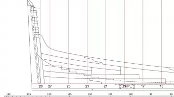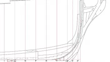 Die mittleren und unteren Linien geben die Krümmung Oberkante der Decksbalken und damit des Decks an. Wenn ich die Vorgehensweise zur Konstruktion richtig verstanden habe, weist die untere Linie gerade im Bereich der Kantspanten Abweichungen zu meiner Rekonstruktion auf.