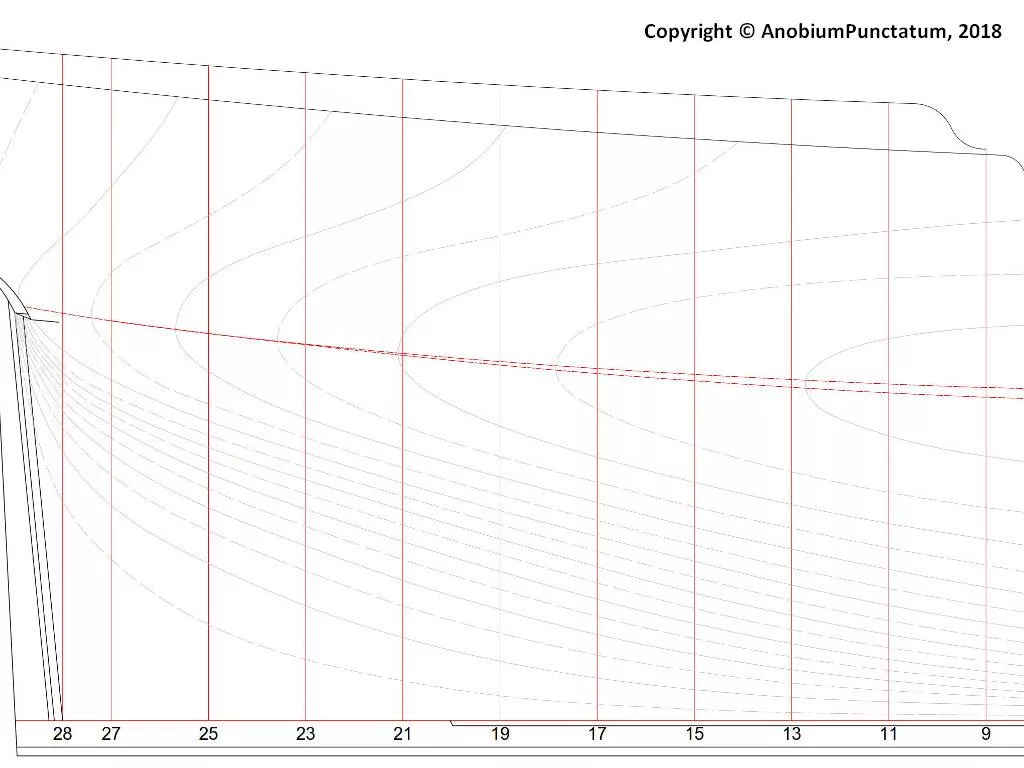 In den letzten 5 Monaten habe ich den Linienriss der HMS Triton anhand der Angaben des As Built Plans rekonstruiert. Bei der Rekonstruktion des Spantrisses habe ich wie früher ausschließlich Kreisbögen verwendet. Abweichend zur damaligen Vorgehensweise habe ich die Linien nicht nur mit Diagonalen, sondern mit einer Reihe von horizontalen und vertikalen Linien kontrolliert.