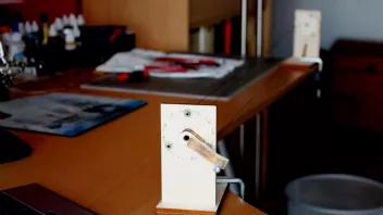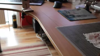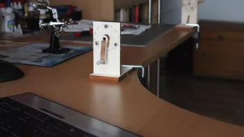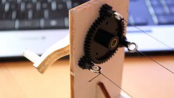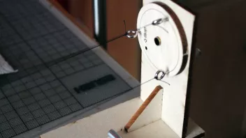 Zuerst werden die beiden "Schlitten" mittels Schraubzwingen an der Tischkante befestigt. Zwischen Getriebeschlitten und Drehtellerschlitten befestige ich drei Taueenden 0,25 mm Amati-Takelgarn schwarz, und zwar so, dass alle drei etwa gleichen Zug haben.