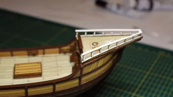 Das Geländer für das Achterdeck habe ich auch gebaut, gestrichen und angebracht. Jetzt fehlt noch das Geländer am Vordeck, Leitern und vier Kanönchen.