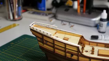 Nun, die Kreuzhölzer waren schnell gebaut. Bei den Geschützen habe ich es bei den zwei Rohren unter dem Achterdeck belassen. Die Bauanleitung sieht noch je zwei weitere auf jeder Seite oben auf dem Achterdeck vor, aber die habe ich, nicht zuletzt mit Blick in diverse Literatur, weggelassen. Später kommt vielleicht noch die eine oder andere kleine Drehbasse auf die Reling, mal sehen.