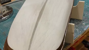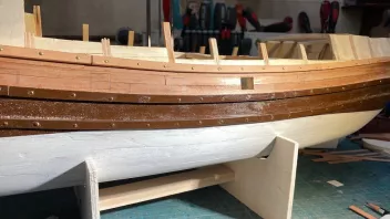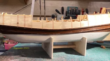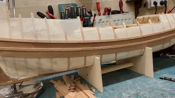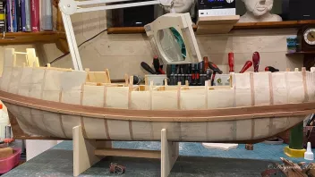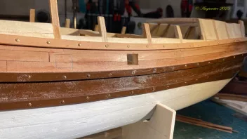 Dazu wurde erst das Tragwerk gefertigt und eingebaut, und dann die Gillung von Außenbords beplankt.
