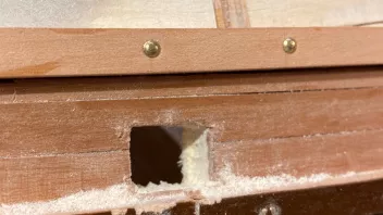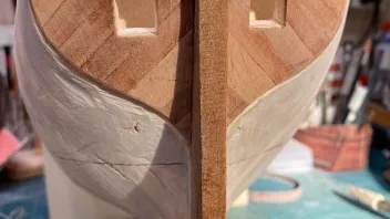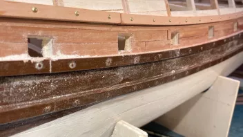 Einige Schritte weiter. Das dritte Bargholz und die zugehörige Plankung wurden fertig gemacht. Anschließend konnten die Positionen der Stückpforten festgelegt werden und es wurde die erste der Pforten ausgeschnitten.