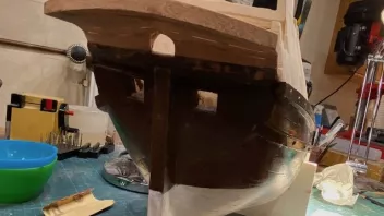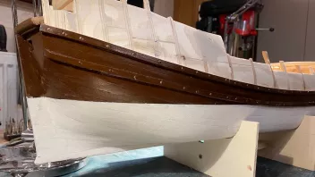 Beide waren keine Luxusjachten des Königs sondern die eine ein Kampfschiff und die andere ein auf Effizienz gebauter Frachter. Was jetzt noch an Spalten da ist wird beim Kalfatern (schleifen zusammen mit im Spaltenbereich leicht aufgebrachtem Weißleim) verschlossen. Dekorationen wird man natürlich an Bug und Heck später auch sehen, aber das hielt sich gegenüber den Kriegsschiffen sehr in Grenzen.