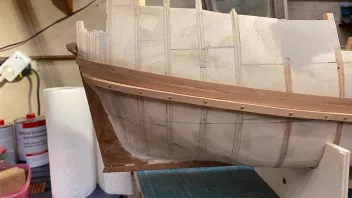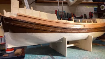 So, jetzt geht es an die Beplankung. Dazu baue ich zuerst das untere Bargholz ein, und setze dann die beiden Plankengänge oberhalb. Dadurch ergibt sich die Lage für das zweite Bargholz. Wenn die beiden Barghölzer fertig sind kommt die Plankung des Unterschiffes an die Reihe. Das Ganze ist noch relativ roh. Feinbearbeitung kommt Morgen.