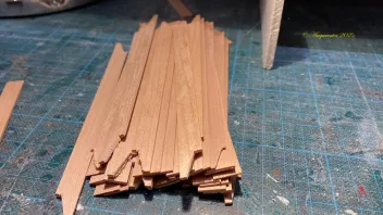 Na gut, immerhin wurde auf beiden Bordseiten das zweite Bargholz aufgelegt, im Weiteren wurden circa 150 Plankenzuschnitte gefertigt, und zwei Plankengänge gearbeitet. Hier ein Teil der Zuschnitte im Bereitschaftslager.