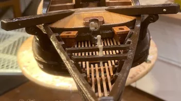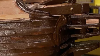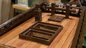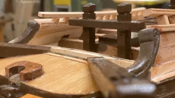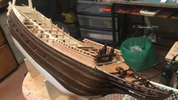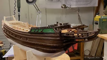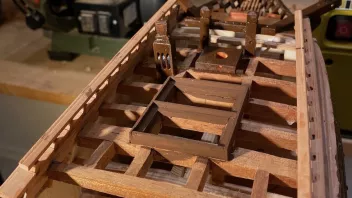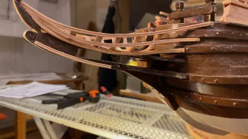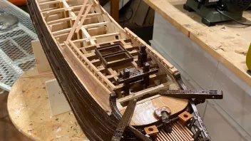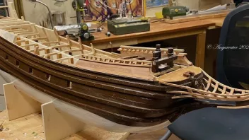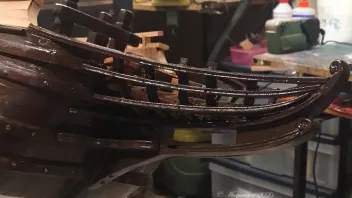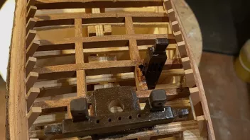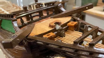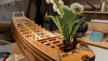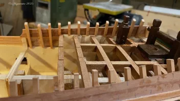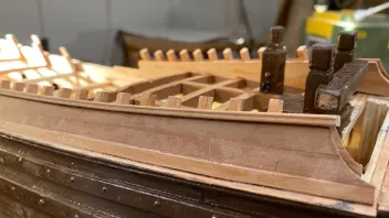 Einige Bereiche wurden vor der Fortsetzung der Arbeiten geteert. Dann galt es die Schanz der Back zu entwickeln. in "Groß" werden die Spantenauflanger beplankt. Beim Modell habe ich das diesmal so gemacht, daß ich die Außenbords Planken der Back zuerst arbeitete, und dann auf Position eingeklebt habe. Das war Mylady eine Dekoblume wert.