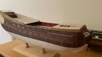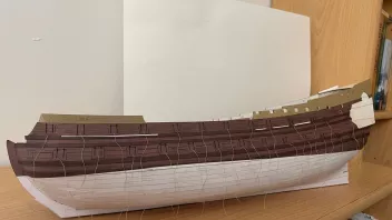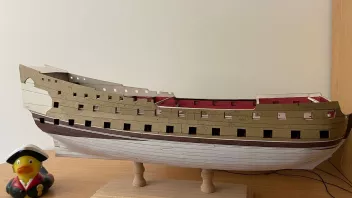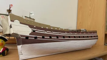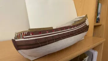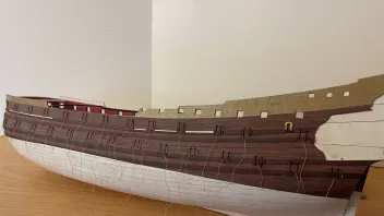 Ahoi allerseits, heute kann ich einen weiteren kleinen Etappenerfolg melden. Die Backbordseite hat jetzt die finale Beplankung bis zur Höhe des Hauptdecks komplett . Die weißen Abschnitte markieren die Plätze für die Rüstbretter. Als kleines Schmankerl habe ich noch das kleine Türchen da oben im hinteren Bereich (wozu auch immer das da ist...) mit einem hübschen Rahmen versehen.