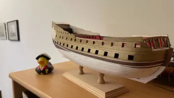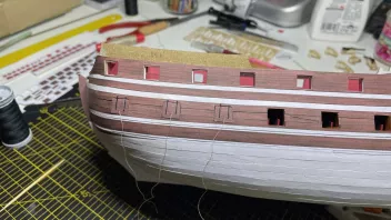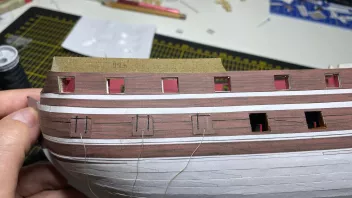 Wenn's läuft, läuft's - steuerbord ist auch die finale Beplankung auf Höhe des Hauptdecks fertig; jetzt kommen auch hier die Stückpfortendeckel und Barkhölzer ran.
