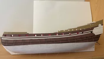 Jetzt geht es an die Steuerbordseite, und da heißt es dann wieder Plankenstreifen ausschneiden, bei den oberen die Stückpfortenöffnungen sauber ausschneiden und aufpassen, dass man immer die richtigen Teile an die richtigen Stellen klebt.