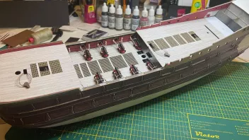 eine Etappe ist abgeschlossen - alle Kanonen des Hauptdecks vollständig getakelt *hüstel* - also zumindest alle, die noch zu sehen sind. :D Ja, das macht ja alles Spaß, aber man will ja auch weiterkommen, also hab ich mir die Kompletttakelung der hinteren Kanonen unterm Achterdeck gespart - da bin ich ehrlich. :pf: