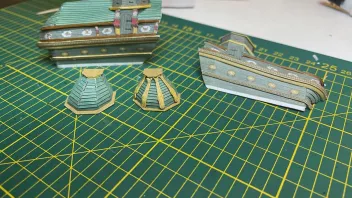 die Seitentaschen sind sozusagen im Rohbau fertig. Die Türmchen kommen erst drauf, wenn die Taschen am Schiff befestigt sind. Und was ich mit "Rohbau" meine, zeigt das Bild. Hier habe ich noch jede Menge Spaß mit winzligsten bunten Streifchen, die dann den ganzen Zierrat an diesem Schiff ausmachen. Einen kleinen Vorgeschmack geben die vier Fische am Steuerbordtürmchen - sind diese Zierlemente dran, sieht das alles gleich viel besser aus. Auch an der Backbordtasche habe ich schon ein paar Zierelemente angebracht. Die zwei kleinen Teile, die ihr da seht, sind grad mal 6 mm lang. Und dann 6 verschiedene Farben, mit denen die Kanten gefärbt werden müssen. Ach, wie ich mich schon auf das Takeln freue! fr21