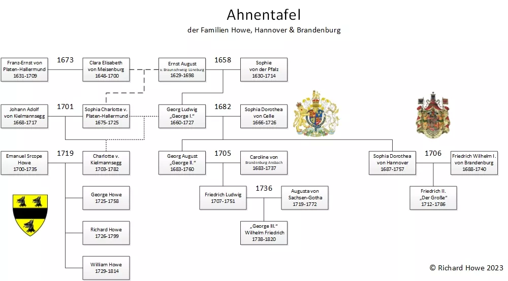 Ob diese „Verbindung“ unmittelbarer oder mittelbarer Natur war, lässt sich nicht mit Gewissheit klären, unmöglich erscheint sie jedoch nicht. Biograph John Barrow (The Life of Richard Earl Howe, London 1838, S. 2) ging davon aus, dass die enge Verbindung der beiden Familien bereits seit der Zeit des Großvaters Scrope Howe als Gesandter am Hof in Hannover existierte.