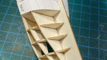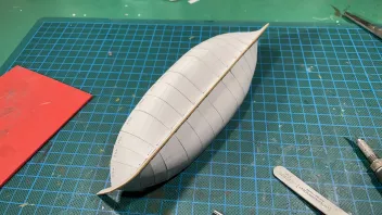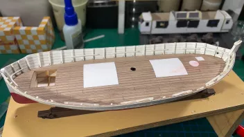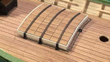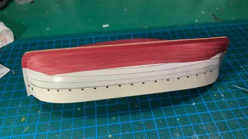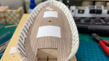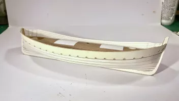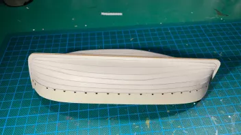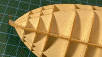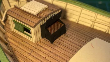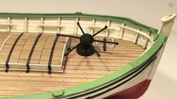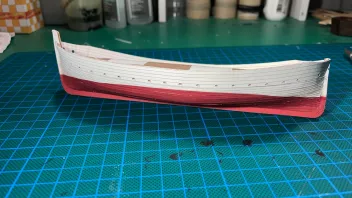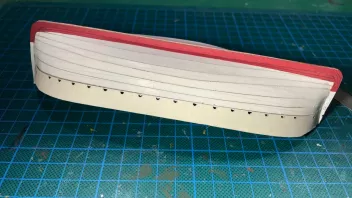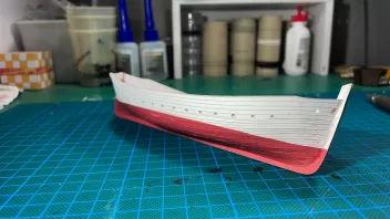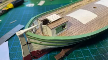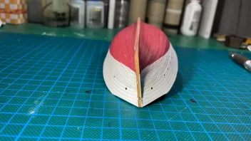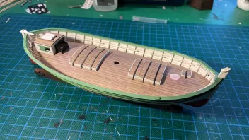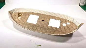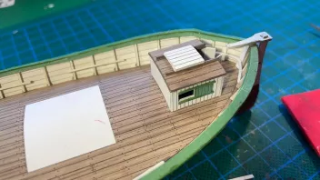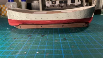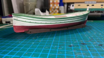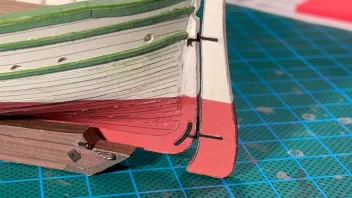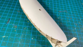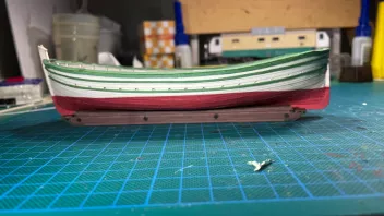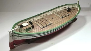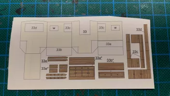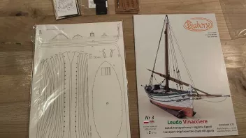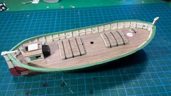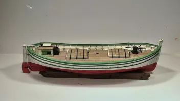 Das Modell ist im für Karton-Segler eher grossen Massstab 1:72 konstruiert, was meinen motorischen (Un-)Fähigkeiten des Takelns entgegen kommt. Ebenso die recht bescheidene Tauführung mit einem Mast und lediglich einer Fock und einem Lateiner-Segel.