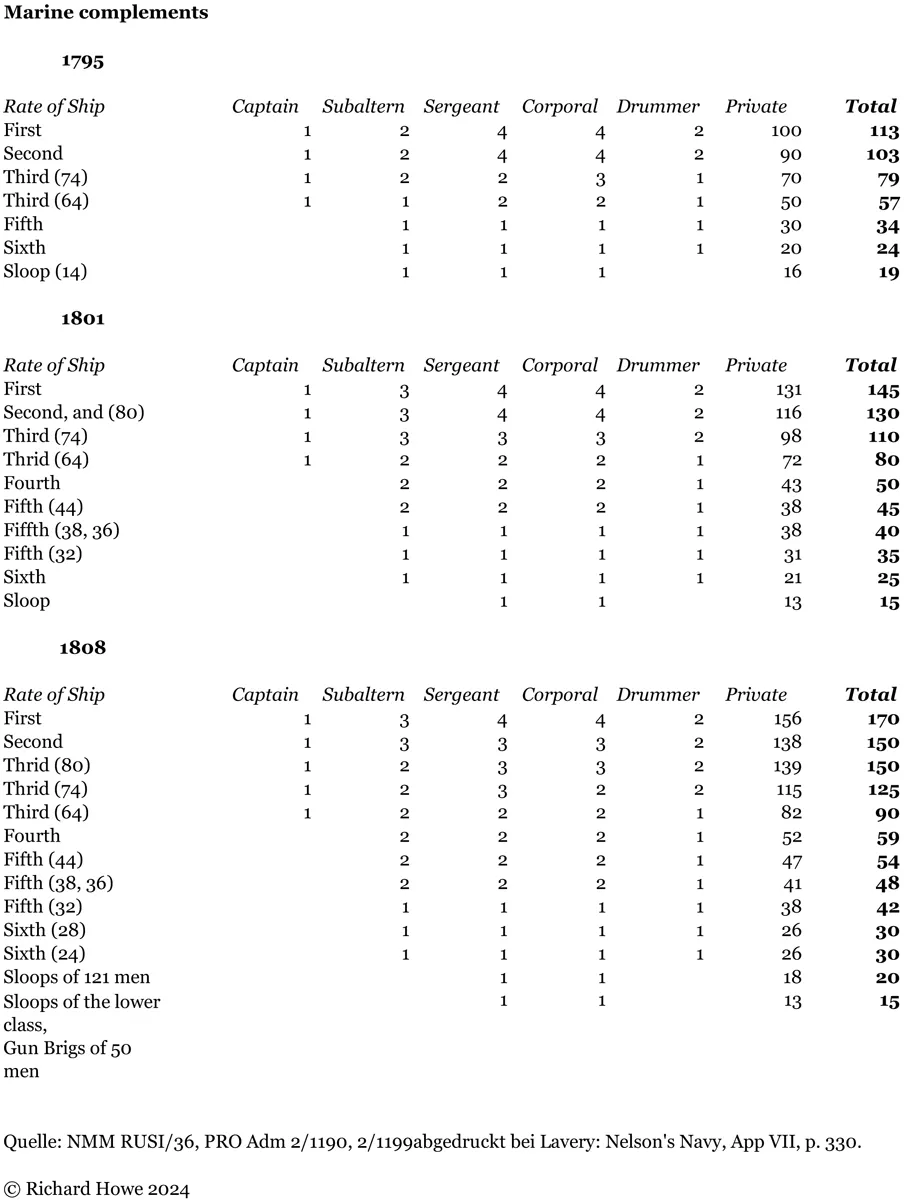 Eigentlich war ich der Meinung, es irgendwo bereits gelesen zu haben, aber tatsächlich finde ich nichts dazu. Gibt es eine zuverlässige Aufstellung, über die Anzahl der Leutnants und Offiziere der Marines auf den Schiffen der einzelnen Raten der Royal Navy und auf den unrated vessels?