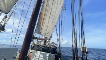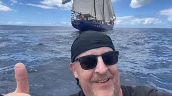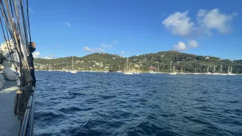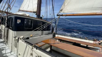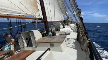 Jeden Nachmittag verwandelte sich das Vordeck in einen großen Wäscheplatz. Klar, die Kapitänsfamilie und ebenso die Mitreisenden, die schon seit Rotterdam an Bord waren, hatten immer mal Bedarf, ihre Wäsche zu waschen. Und wenn wir baden oder schnorcheln waren, hängten wir natürlich die Badesachen und Handtücher ebenfalls dort auf. Am nächsten Morgen war dann immer alles trocken, und die provisorisch angebrachten Leinen verschwanden rechtzeitig, bevor das erste Segel gesetzt wurde. :wf: