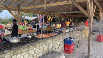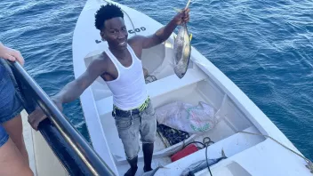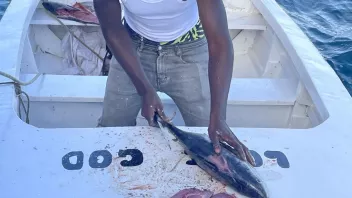 An diesem Morgen, noch vor dem Frühstück, klopfte ein einheimischer Fischer bei uns an die Bordwand und präsentierte stolz seinen Fang: Drei Thunfische! Lotus, unsere Smutje, war sofort begeistert und kaufte alle drei. Der Fischer hat dann die Thuns gleich auf seinem Boot sauber filetiert, und als er die erste Karkasse über Bord warf, hat Lotus heftig interveniert und ihm die anderen beiden auch noch abgekauft.