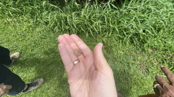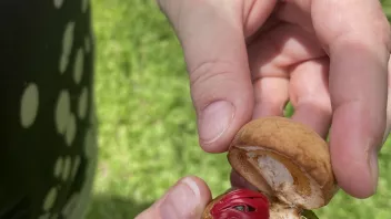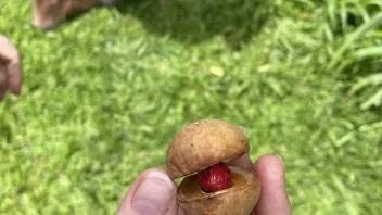 Ich bin ehrlich: Ich hatte mir bisher keine Gedanken gemacht, wie die Muskatnuss wächst. Ich habe sie immer auf die Molukken verortet, was auch erst mal nicht so verkehrt ist. Die Geschichte dieser in früheren Zeiten teuren und hart umkämpften Handelsware ist hochinteressant! Heute ist sie für Grenada DER Exportschlager. Japal hat uns einen Baum direkt am Straßenrand gezeigt; wir haben dann zwei reife Nüsse mitgenommen. Wer das - wie wir - bisher auch nicht wusste: Wenn sie so am Baum hängt, sieht sie wie eine gelbe Kastanie aus. Wenn sie reif ist, springt sie auf, und man sieht das Innere. Die Nuss ist von roten Fäden umzogen, die auch, wie das Fruchtfleisch, für verschiedene Anwendungen genutzt werden. Hat man die roten Samenfäden entfernt, muss man noch die Nuss knacken, denn die eigentliche Muskatnuss ist im Inneren.