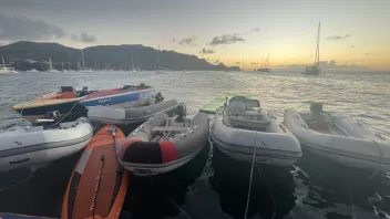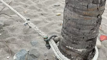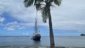 Heute bekommen wir einen Ankerplatz etwas entfernt vom Hafen zugewiesen. Da der Ankergrund hier nicht der sicherste ist, bringt Floris noch zwei Kopfleinen aus - und in Ermangelung eines festen Stegs und Pollern muss eben eine recht stabil aussehende Palme dafür herhalten. :D