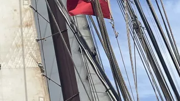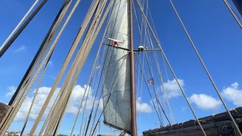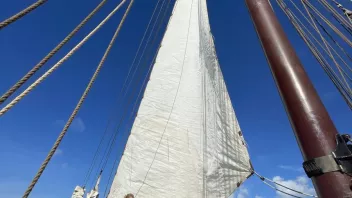 Was auch neu für uns war, sind die sog. Strecker. Die gibt es sowohl für die drei Vorsegel als auch die beiden großen Schonersegel. Und das funktioniert so: Zuerst wird am Fall (bei den Vorsegeln) bzw. an der Klau und der Piek beim Segelsetzen so lange gezogen, bis es kräftemäßig nicht mehr weiter geht. Dann belegen, festmachen, und jetzt kommt der Strecker ins Spiel, eine zusätzliche Talje, mit der der letzte Meter beim Hochziehen des Tuchs locker von zwei bis drei Leuten erledigt wird.