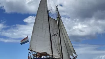 Als dann der Wind plötzlich abflaut, gehe ich zu Käptn Floris und frage, ob wir nicht das Dingi (so nennen sie ihr Beiboot) runterlassen können und mit uns gruppenweise Fototouren ums Schiff machen können. "Ja, klar doch, Bonden! Mensch, dass ich da nicht dran gedacht habe - das machen wir doch immer!" war die Antwort. Und dann passierte was sehr Schönes: Kaum saß ich mit anderen im Dingi, kam wieder richtig schöner Wind auf! Und der hielt auch noch an, als Jessica ihre Runden drehte.