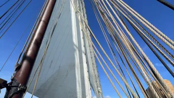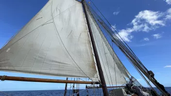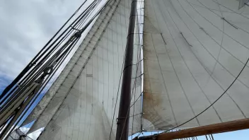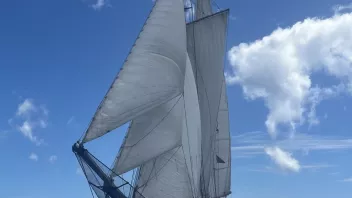 Da wir heute heftigen Wind erwarten, wird in jedes der beiden großen Segel ein Reff eingebunden, ehe sie gesetzt werden. Das Segeln ist dann wieder Spaß pur, wir pflügen nur so durch das Wasser, und das bei teilweise bis zu 8° Schräglage. Klingt nicht viel, aber nehmt mal einen Winkelmesser und stellt es nach. Oder schaut euch dieses Bild hier an: