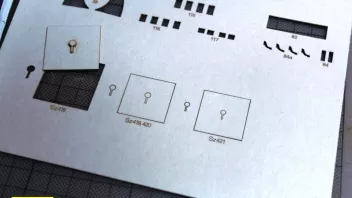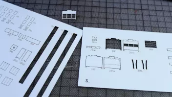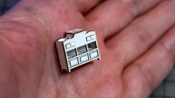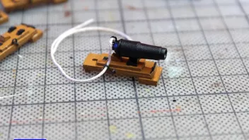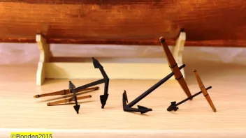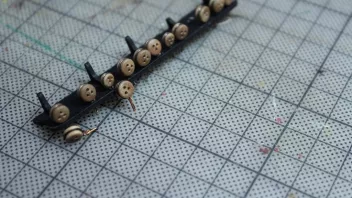 Diese kleinen Klampen sind in einem der dicken Finnpappebögen. Hier ist es unerlässlich, diese vor dem Heraustrennen mit Sekundenleim zu tränken, ansonsten zerfasern sie gnadenlos. So aber ware sie sehr stabil. Angemalt habe ich sie aber erst nach dem Anbringen - gut, dass die erforderliche Farbe die selbe wie der Hintergrund war...![]()