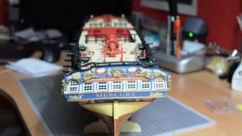 Dann kam auch das Geländer auf die Heckreling; auf dem Vordeck wurden die Poller auf der Reling angebracht.