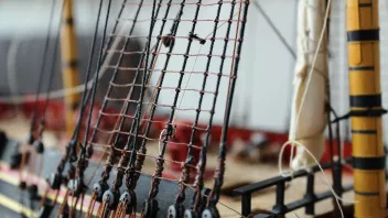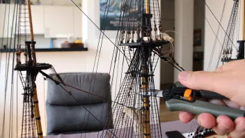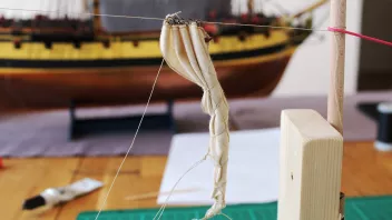 Jetzt wurde das neue Stag um den Top gelegt und vorschriftsmäßig mit großem Auge und Stagmaus befestigt. Nun konnte ich das gut gestaute Segel drüberfädeln. Der schwierigste Teil kam jetzt: Das lose Ende des Stags musste durch eine Kausch am Leitkragen am Großmast geführt werden und dann so ca. 6 cm weiter mit einer Kausche versehen werden. Das war arg eng, aber letztendlich hatte ich es geschafft, ohne etwas anderes abzureißen, und konnte diese frisch eingebundene Kausche mit der am Leitkragen ein kleines Stück tiefer mittels Taljereep verbinden und so mein Stag steifsetzen. Dann wurde das Stagsegel an seinen Platz geschoben. Das lose Ende des Niederholers wird einfach nur an der Mastbeting des Großmastes belegt. Die Halsleinen, also die zwei am vorderen unteren Ende, haben auch eine interessante Führung: Am jeweils vierten Wanttau des Großmastes wird binnenbord eine Leitkausche befestigt. Durch diese wird das Tau geführt und dann an einer am gleichen Want weiter unten binnenbord befestigten Wantklampe belegt. Das Anbringen der Klampe war auch lustiger Sport; glücklicherweise habe ich mit den Ätzplatinen von dafi auch viele tolle Klampen - bei den winzigen Pappdingern aus dem Bausatz wäre ich ja durchgedreht...