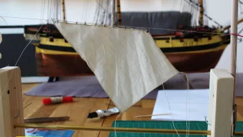 Zum Bausatz der Mercury gehört auch ein kompletter Segelsatz - aus Stoff natürlich. Was mich anfangs irritiert hat: Es sind viel mehr Segel als der Bauplan vorsieht. Schaue ich dann aber in meinen Schrage, sehe ich, dass Shipyard exakt alle Segel beigefügt hat, die historisch korrekt vorgesehen waren. Der Bauplan verzichtet aber auf Fockstagsegel, Großstagsegel, Mittelstagsegel und Besanstagsegel. Gleichwohl liegen diese auch bei. Das finde ich gut - so hat der Modellbauer, der gern alle Stagsegel zeigen will, auch die Möglichkeit, alle Segel in der selben Farbe und Stoffart zu verwenden.