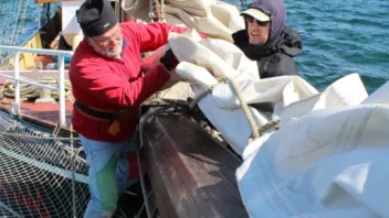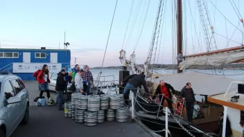 Los ging es wieder in Kiel. Nach einer sehr kurzweiligen Anreise von Berlin, gemeinsam mit etlichen weiteren Mitsegelnden, kamen wir abends an der Blücher-Brücke an, wo unser Schiff schon auf uns wartete. Das übliche Ankunftschaos löste sich nach und nach in so etwas wie Ordnung auf; man muss ja immer wieder staunen, welche enormen Mengen an Gepäck 30 Menschen mit an Bord bringen und wie sich das alles irgendwie so verteilt, dass alles verstaut ist und auch jeder seine Sachen findet. Und dann galt es ja noch, die lebenswichtigen Dinge an Bord zu verstauen (im Bild vorn):![]()